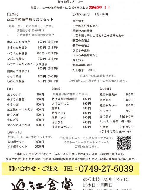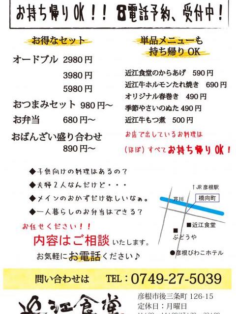 近江食堂のお料理は、ほぼ全てお持ち帰りできます!