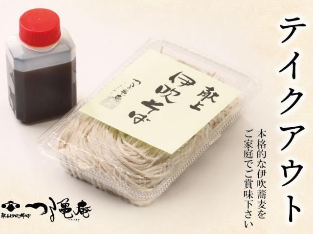 日本の「そば発祥の地」とされる伊吹山麓で栽培された伝統ある在来品種「伊吹蕎麦」です。テイクアウトの生蕎麦は調理がしやすいように、蕎麦6小麦粉4の割合で打っております。風味豊かな生そばをご家庭でお召し上がり下さい。